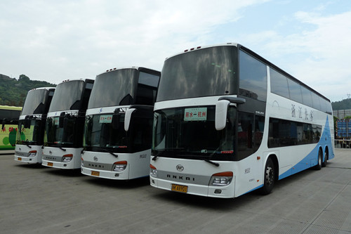 根據(jù)杭州線客流穩(wěn)中有升,尤其是周末及節(jié)假日運力不足的情況,8月3日,快客分公司新購置的4輛55座安凱客車上線營運。新購置的55座安凱豪華客車為雙層豪華大巴,上層40座,下層15座。下層配備3臺15寸液晶,上層配1臺17寸彩色液晶,該車的倒車監(jiān)視器還帶多動畫面,能手動切畫,監(jiān)視上下層車內(nèi)情況,配備電子巡航系統(tǒng)等。車身13.7米,比原杭州線所用的37座安凱客車車身長1.7米。