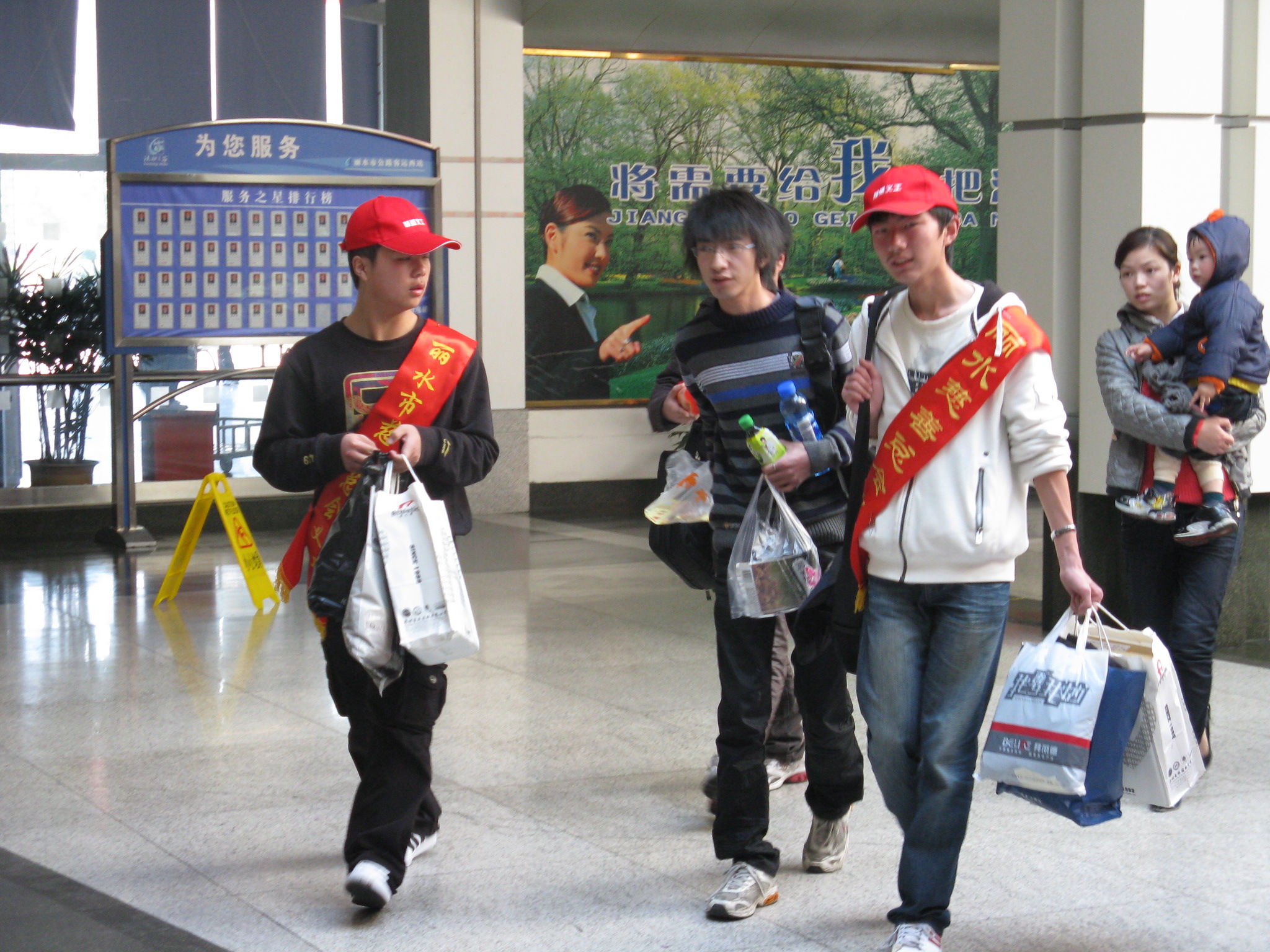 2月10日早,麗水客運(yùn)東站、客運(yùn)西站站場(chǎng)出現(xiàn)了一大批“小紅帽”,他們穿梭于售票大廳、候車室、發(fā)車區(qū)、下客區(qū)等處,有的熱情幫助旅客提行李;有的為在一旁候車的旅客送上熱騰騰的開水;有的抱小孩扶老人上車;還有的在危檢儀旁勸導(dǎo)旅客將行李進(jìn)行危檢。一個(gè)個(gè)忙得不亦樂乎!成了春運(yùn)現(xiàn)場(chǎng)的一道亮麗風(fēng)景。 這些“小紅帽”來(lái)自麗水市慈善總會(huì),他們當(dāng)中有義工,有受慈善總會(huì)捐助的學(xué)生,一共20余人。一個(gè)個(gè)都頭戴小紅帽,身披市慈善總會(huì)的授帶。特意來(lái)到客運(yùn)東、西站,為南來(lái)北往的旅客送上熱情的幫助。他們的到來(lái),得到旅客的贊許。
