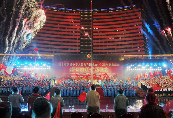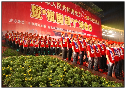 麗水市慶祝新中國成立60周年紀(jì)念活動(dòng)暨“祖國頌”廣場(chǎng)歌會(huì)隆重舉行。歌會(huì)分革命英雄贊、建設(shè)新中國、走進(jìn)新時(shí)代三個(gè)篇章進(jìn)行。15個(gè)方陣依次進(jìn)行大合唱,每個(gè)方陣各唱一首歌。