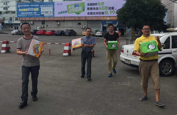 經理梁巍、副經理王斌、計財科科長厲志南和運務科的蔡亞飛各捧著一箱冷飲去送清涼。