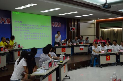 “十八大報(bào)告指出:要建設(shè)什么樣的馬克思主義執(zhí)政黨------搶答開始?!彪S著主持人的一聲令下,最吸引眼球的搶答環(huán)節(jié)開始了。10支代表隊(duì)快速摁下?lián)尨鹌鳎@里比的不僅是黨史知識,更是快速反應(yīng)的能力。40道搶答題,有的隊(duì)反應(yīng)快速,答題準(zhǔn)確,加上10分;有的隊(duì)答題心切,違規(guī)搶答,被倒扣分?jǐn)?shù);有的隊(duì)搶到了,答題不是很準(zhǔn)確,也被倒扣分?jǐn)?shù)。臺下黨員隨著他們的表現(xiàn)一會會心一笑,一會兒加油鼓掌,全場氣氛熱烈。