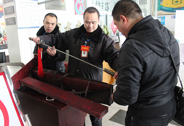 西站安檢崗位潘峰、金翔、鐘韶華值班三位同志在值班。今天客流量大,是平時(shí)的一倍左右,安檢員們工作也都比往常更認(rèn)真仔細(xì)了。80:50分左右,鐘韶華、金翔發(fā)現(xiàn)一名男子提著三盒包裝精美的禮盒經(jīng)過安檢。鐘韶華忙禮貌上前將該男子叫到一邊,讓他開包檢查。經(jīng)檢查,三盒均為龍泉寶劍,其中兩把寶劍未開封可攜帶,一把寶劍已開封不能攜帶上車,按規(guī)定對(duì)這把寶劍進(jìn)行了登記暫扣處理。該男子也很配合安檢員的工作,直夸安檢員們工作認(rèn)真細(xì)致。