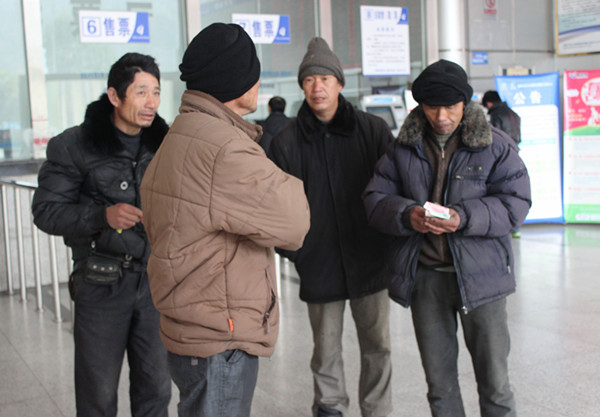 早上8:30,老吳和他的工友們?cè)缭绲氖帐昂眯欣?,到西站買好下午1:25去泰順的車票,這會(huì)兒拿到票,哥兒幾個(gè)才安心的準(zhǔn)備去吃早飯。他們按捺不住心中的喜悅說:“在外辛苦了一年能在春運(yùn)第一天順利買到車票回家過年,很開心!”