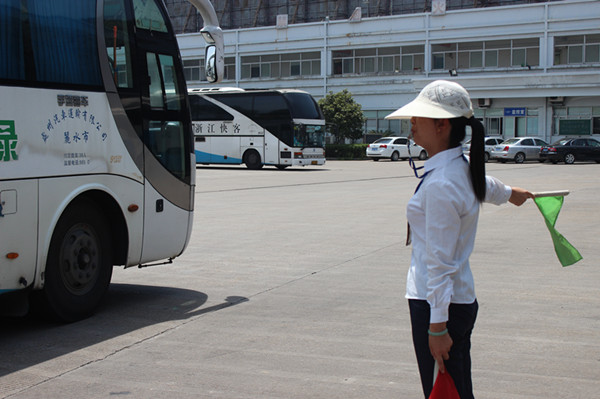 正午時(shí)分,行車(chē)員們頂著烈日,揮動(dòng)著紅綠旗,認(rèn)真地為車(chē)輛引航,安全及時(shí)地送出一撥撥旅客。愛(ài)美之心人皆有之,行車(chē)組的姐妹們也不例外,可是為了發(fā)車(chē)安全,一件長(zhǎng)袖襯衫、一頂遮陽(yáng)帽就是她們面對(duì)毒辣太陽(yáng)的全副武裝。