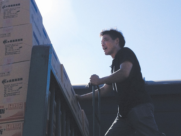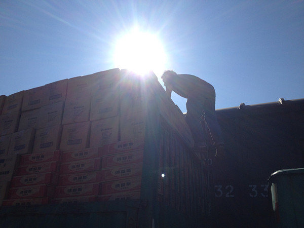 7月29日14:05,南明物流貨運駕駛員高麗平在烈日下忙碌地裝卸貨物