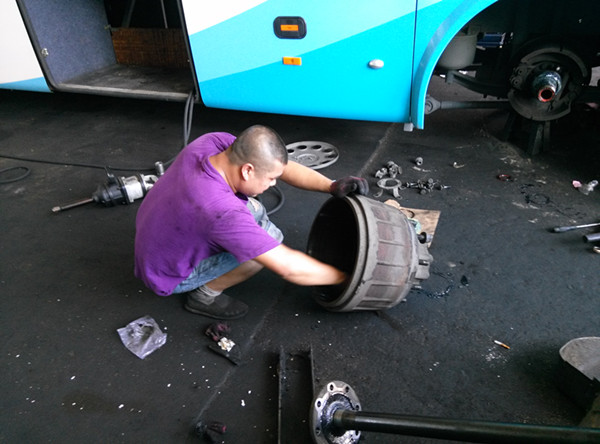 客長運分公司維修車間,何軍海師傅正在緊張的修理汽車輪轂