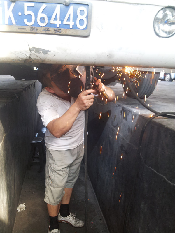 客長運分公司修理工陳勇軍師傅正在進行電焊作業(yè),灼眼的火星、淺藍的焊霧、嗆鼻的氣味彌漫維修車間