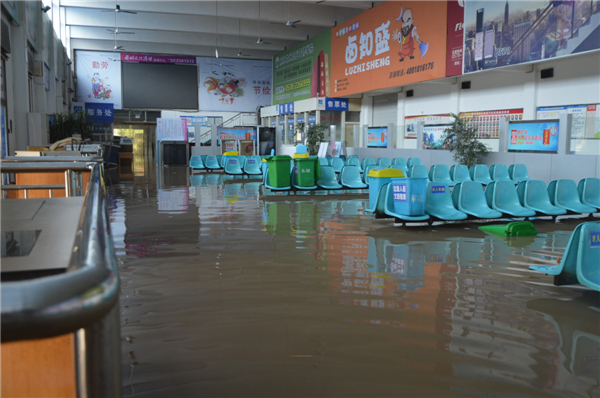候車廳內(nèi),積水大概有四五十厘米