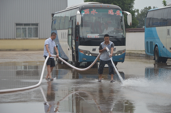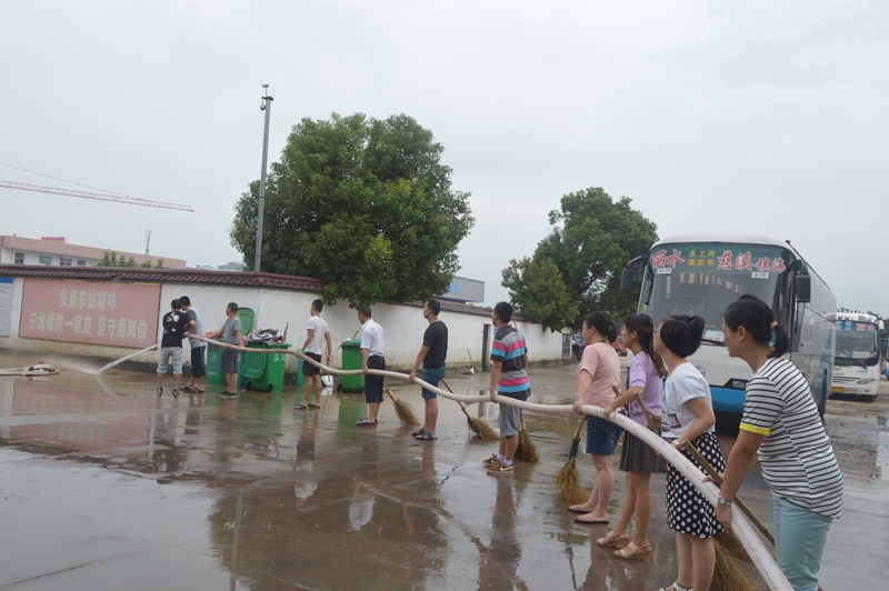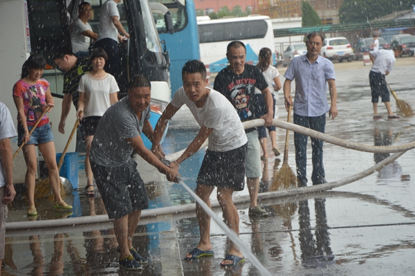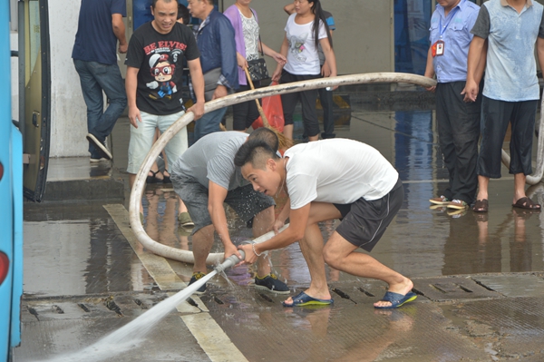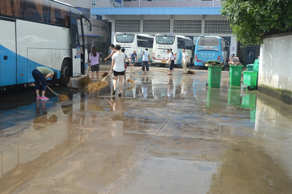 長運公司修理車間、調度室等昨天也受到了重創(chuàng)。一大早,修理工師傅們早已拿起水槍,打掃修理車間;員工們開始沖洗辦公場地。