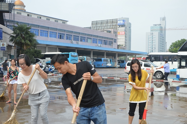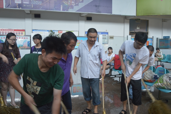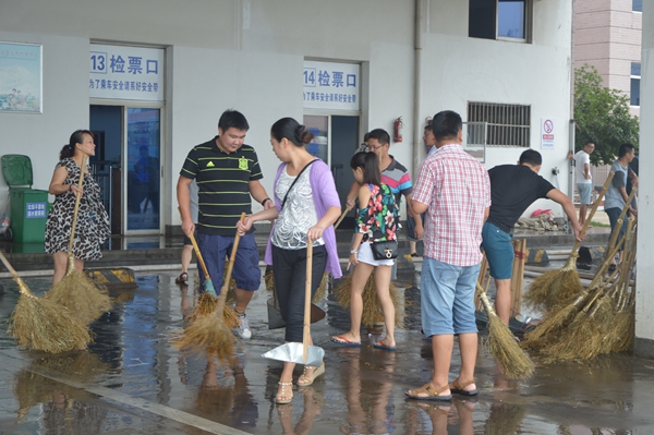 旅游集散的青年隊伍來了,經(jīng)理葉劍飛和員工們一道正起勁地沖洗著候車室。