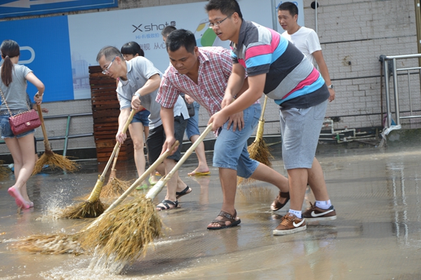 南明文化傳媒的兄弟來了,經(jīng)理馬偉文為大家運來了清掃站場的掃帚等工具。分發(fā)完工具后,大家馬上投入到救援當中。