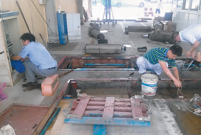 修理車間是客長(zhǎng)運(yùn)分公司的重災(zāi)區(qū),洪水過(guò)后留下垃圾、淤泥一大片;8 條地溝全泡在污水里,其中一條自動(dòng)檢測(cè)線因長(zhǎng)時(shí)間受洪水浸泡,受損嚴(yán)重。車間負(fù)責(zé)人快速找來(lái)電泵,先把地溝里的水抽去。為盡快恢復(fù)災(zāi)后生產(chǎn),保證車輛安全運(yùn)行,客長(zhǎng)運(yùn)分公司專門成立了搶修門檢線應(yīng)急小組,由王斌副經(jīng)理負(fù)責(zé); 檢測(cè)站派出金軍輝和金曉東兩位技術(shù)人員幫忙搶修; 集團(tuán)公司生產(chǎn)經(jīng)營(yíng)部經(jīng)理江少華也在做技術(shù)指導(dǎo)。大家不間斷工作十余小時(shí),終于在晚上 7:00 左右,手工檢測(cè)線搶修完畢,恢復(fù)正常工作。
