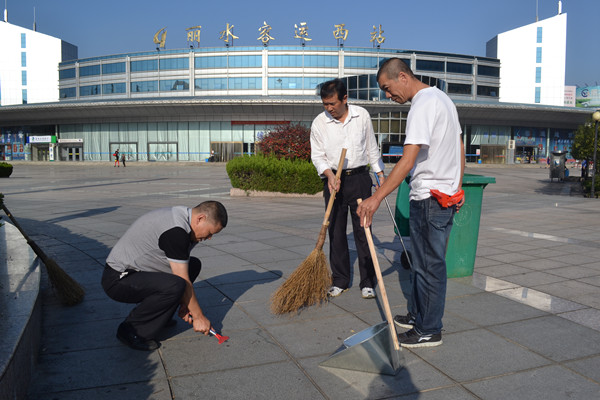 勞動(dòng)中,大家齊心協(xié)力、分工合作,用夾子把綠化帶中的紙屑、塑料袋、煙頭等一點(diǎn)點(diǎn)的夾出來,一點(diǎn)點(diǎn)地鏟除地面殘留的口香糖,我掃地,你倒垃圾,配合十分默契。雖然大家干的額頭冒汗、蹲的雙腳發(fā)麻,但是誰都沒停下手中的工具。經(jīng)過黨員的共同努力,西站站前廣場(chǎng)的地面變得更干凈了。