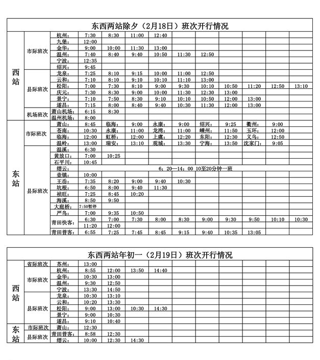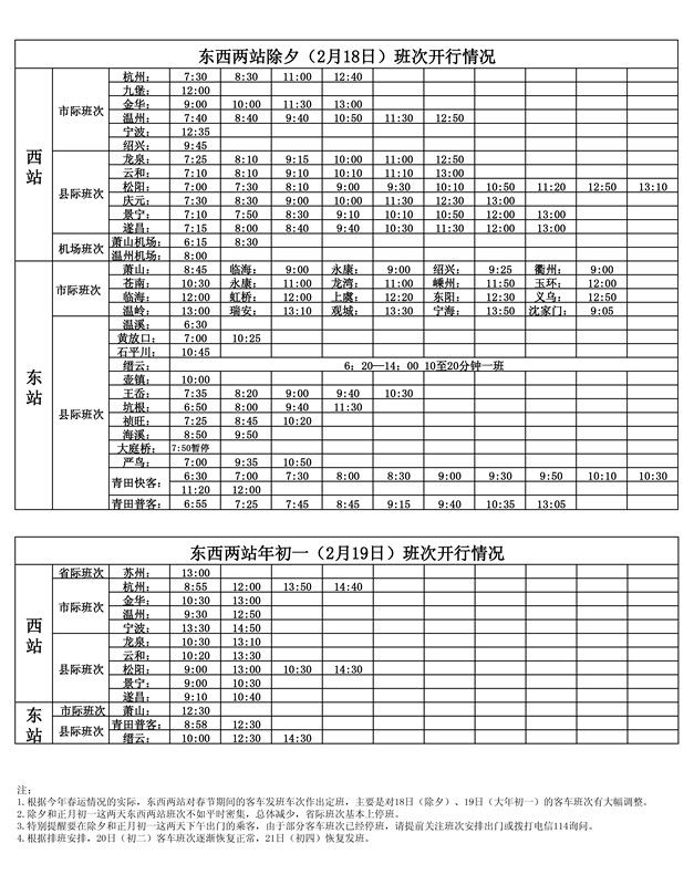 根據(jù)今年春運實際的情況,東、西兩站對春節(jié)期間的客運班車作出調(diào)整。2月18日(除夕)、19日(大年初一)的客運班次變動較大,密集減少,省際班次基本上停班。特別提醒要在除夕和正月初一這兩天下午出門的乘客,由于部分客車班次已經(jīng)停班,請?zhí)崆瓣P(guān)注班次安排,或撥打電信114詢問 ,盡量提前購票以免耽誤您的行程。從2月20日(初二)起客車班次逐漸恢復(fù),2月22日(初四)起全部恢復(fù)正常發(fā)班。