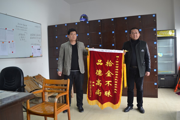 12月21日下午2點(diǎn),失而復(fù)得4萬(wàn)現(xiàn)金的李先生手拿錦旗來(lái)到快客車(chē)隊(duì),一再對(duì)黃樂(lè)平師傅拾金不昧的行為精神表示感謝,他說(shuō):“黃樂(lè)平師傅在發(fā)現(xiàn)遺失物品時(shí),能夠包管完好,可見(jiàn)平時(shí)他就是一位非常盡責(zé)的駕駛員。那天我發(fā)現(xiàn)丟了4萬(wàn)元現(xiàn)金的時(shí)候,我頓時(shí)全身冒冷汗,這可怎么辦好呢。當(dāng)我趕回麗水,看到拉桿箱好好的放在這里時(shí),我懸著的心終于放下了?!崩钕壬f(shuō):“今天我送來(lái)一面錦旗,就是再次感謝敬業(yè)的黃師傅,感謝公司培養(yǎng)出的駕駛員如此優(yōu)秀,希望公司能多宣傳正能量,多表?yè)P(yáng)黃師傅這樣的好人”說(shuō)著,李先生將一面印有“拾金不昧 品德高尚”的錦旗送到余副經(jīng)理手中(因黃樂(lè)平出車(chē),未能和乘客碰面)。
