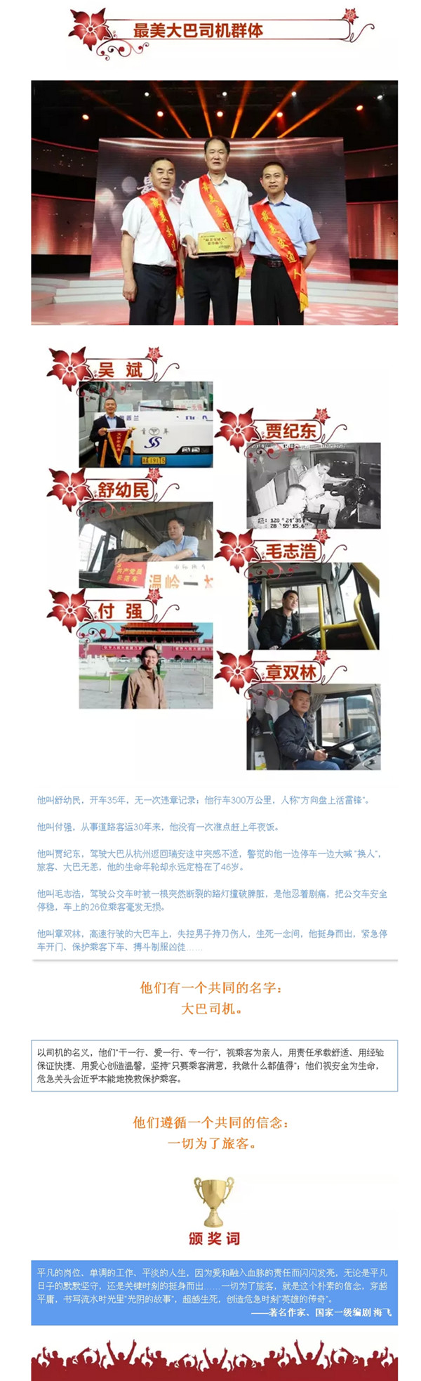 5月28日,省交通運輸廳在浙江廣電集團“最美浙江人?最美交通人”發(fā)布廳,發(fā)布了8位“最美交通人”個人和4家“最美交通人”集體的先進事跡,麗汽集團客長運分公司駕駛員章雙林與其他5位大巴司機一起組成的“最美大巴司機群體”名列其中。
