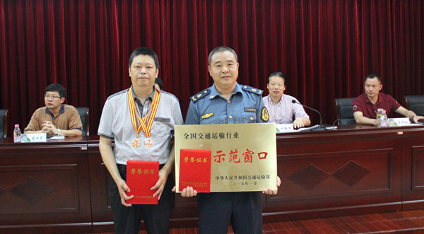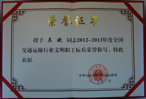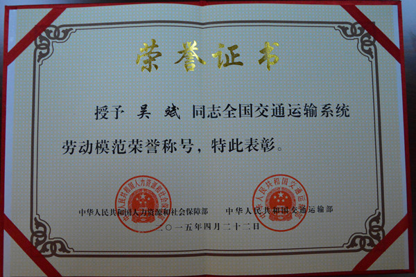 吳斌(左)榮獲全國交通運(yùn)輸系統(tǒng)勞動模范、全國交通運(yùn)輸行業(yè)文明職工標(biāo)兵稱號