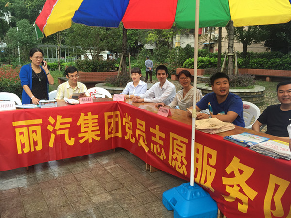 活動(dòng)當(dāng)天,麗汽集團(tuán)的黨員們一早就來(lái)到燈塔公園,面向廣大群眾展開(kāi)了汽車班車時(shí)刻咨詢、汽車銷售維修、汽駕培訓(xùn)咨詢、旅游咨詢、房產(chǎn)銷售咨詢等多項(xiàng)服務(wù)。雖然天空中飄著雨,但黨員同志和社區(qū)群眾的熱情不減,短短半天時(shí)間,黨員們共向到場(chǎng)群眾發(fā)放宣傳冊(cè)頁(yè)及資料2000份,解答咨詢60人次,贈(zèng)送雨傘200余把,紙巾100盒,環(huán)保袋500只,惠及群眾800人次。
