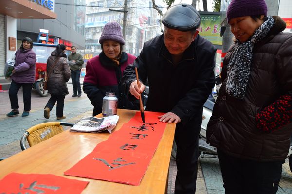 退休老黨員蘭延生、陳根松冒著嚴(yán)寒一大早來到了服務(wù)現(xiàn)場,在現(xiàn)場為市民們義務(wù)寫對聯(lián)、送對聯(lián),蘭老的字清秀大方,陳老的字遒勁有力,在一旁觀看的市民“嘖嘖”稱道,他們自覺排起了長隊(duì),耐心等待著兩老的“墨寶”,成為“黨員服務(wù)一條街上”的一大亮點(diǎn)。