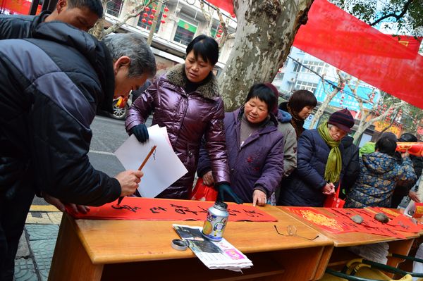 “貼上真正寫的春聯(lián),才有過年的味道”,一位排隊(duì)等候的姑娘對蘭老的字情有獨(dú)鐘。家住白云小區(qū)的齊大媽更是感慨自己已65歲,上還有90歲高齡母親,非要請?zhí)m老寫下:“今日正逢萱草壽,前身合是杏花仙”,橫披“九十大壽”對聯(lián),作為母親九十大壽的賀禮。拿到對聯(lián)后的齊大媽稱心滿意地說:“今天我非常高興、開心,你們這么冷的天為我們義務(wù)寫對聯(lián),抽出休息時(shí)間為人民服務(wù),祝福你們麗汽集團(tuán)生意越做越大。”