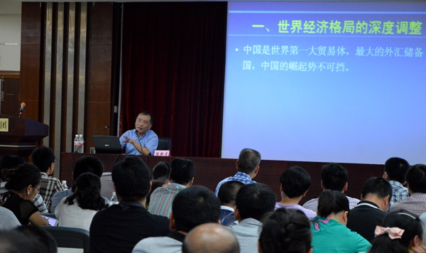 在上課過(guò)程中,陳敬東教授圍繞世界經(jīng)濟(jì)格局的深度調(diào)整、中國(guó)經(jīng)濟(jì)的換檔期和陣痛期、大膽創(chuàng)新落實(shí)改革意圖、中國(guó)經(jīng)濟(jì)的發(fā)展趨勢(shì)分析及新形勢(shì)下企業(yè)如何應(yīng)對(duì)挑戰(zhàn)等五個(gè)方面對(duì)當(dāng)前宏觀經(jīng)濟(jì)形勢(shì)進(jìn)行了分析講解。在企業(yè)如何應(yīng)挑戰(zhàn)中,陳教授指出:在當(dāng)前形勢(shì)下,企業(yè)應(yīng)從培育新的意識(shí)、找準(zhǔn)新的定位、制定新的戰(zhàn)略、開(kāi)發(fā)新的產(chǎn)品和服務(wù)、建立新的品牌等方面進(jìn)行努力,迎接新一輪挑戰(zhàn)。