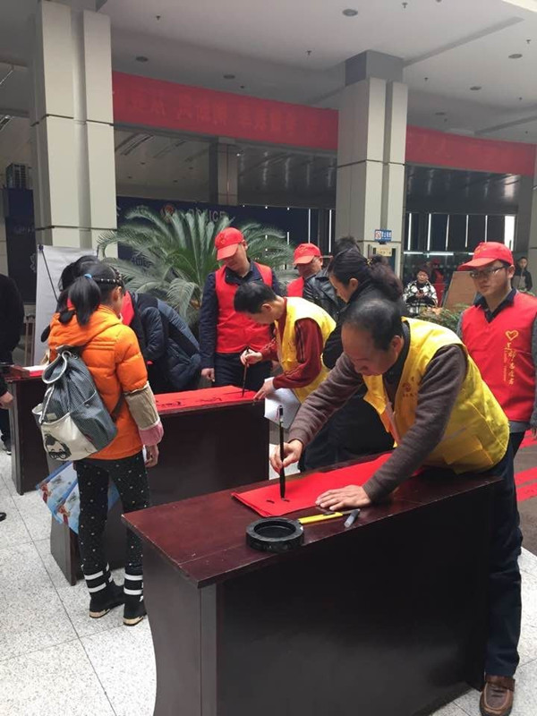 總工會的志愿服務(wù)隊伍還帶來了“志愿者書寫春聯(lián)”,現(xiàn)場寫就的200多幅春聯(lián)很快就被乘客們領(lǐng)取一空。