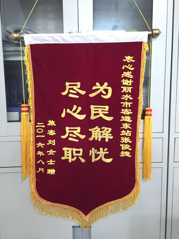 8月20日上午,一位女士將一面錦旗送到客運(yùn)東站站長值班室,握著值班站長的手一個(gè)勁地道謝。錦旗上赫然寫著:“盡心盡職,為民解憂”八個(gè)醒目的大字,感謝麗水客運(yùn)東站張俊捷。