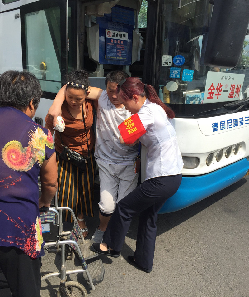 9:35金華到麗水的班車緩緩地駛進(jìn)了高鐵配載點(diǎn)。車一停穩(wěn),旅客們便陸陸續(xù)續(xù)的下車前往下一個(gè)目的地。眼尖的江旭紅看見一位中年婦女在車門處很吃力的拉著什么,江旭紅心想,車上可能有行動(dòng)不便的旅客需要下車。江旭紅全然不顧烈日的暴曬,毫不猶豫的迎上前去。果不其然,車門處的阿姨和車上的另一個(gè)阿姨正連拉帶抱的幫一位行動(dòng)不便的大叔下車。大叔看上去50多歲的樣子,因?yàn)榈昧四撤N疾病一點(diǎn)都不會(huì)做自主的動(dòng)作,全憑兩位阿姨慢慢地挪動(dòng),160多斤的體重給兩位阿姨扶他下車增加了不少的難度。才移下一個(gè)臺(tái)階,汗珠已經(jīng)順著兩位阿姨的臉頰往下淌。江旭紅立即從行李倉拿出他們隨車攜帶的輪椅撐開,放在車門旁。由于車子臺(tái)階處較窄,站不下其他的人,江旭紅就在車下位置幫著把大叔的腳抬起來,待大叔被移到最后一級(jí)臺(tái)階時(shí),江旭紅順勢(shì)托起大叔的一只手,和車上那位阿姨一起,使盡渾身力氣一步一步慢慢地把大叔架到了輪椅上。接著江旭紅又把大叔送到陰涼處,等待家人來接。這時(shí)的江旭紅已是滿頭大汗,背上的衣服都濕透了。