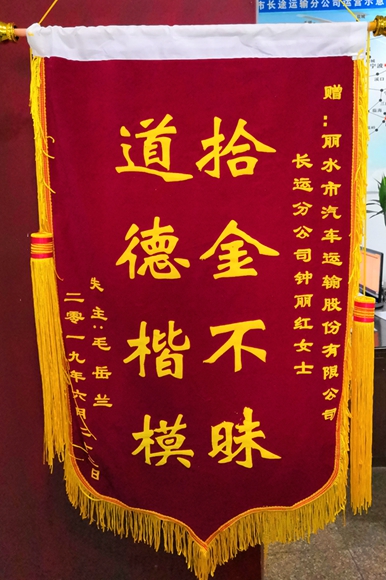 7月5日上午,一位老大爺來(lái)東站找到車(chē)隊(duì),將一面寫(xiě)著“拾金不昧,道德楷?!卑藗€(gè)大字的大紅錦旗,送到長(zhǎng)運(yùn)(東站)車(chē)隊(duì)長(zhǎng)鄭國(guó)勇手里,一定要好好感謝車(chē)隊(duì)駕駛員鐘麗紅。