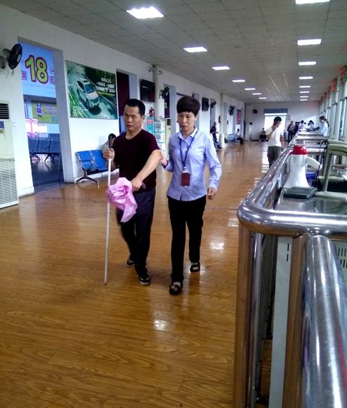 7月10日上午,一位盲人獨(dú)自來到客運(yùn)東站,準(zhǔn)備乘車去青田。盡管有盲杖的輔助,盲人的行動(dòng)還是顯得遲緩又無助。剛好經(jīng)過售票廳的行車員江雯看到了這一幕,她走上前去跟盲人旅客說明身份,問他需不需要幫助。得到盲人旅客的信任后,江雯到售票窗為盲人旅客購買好了9:50到青田的車票,之后江雯又扶著盲人旅客到候車廳的座椅上等待,由于自己的檢票臺(tái)有班次需要檢票發(fā)車,江雯就把照顧盲人旅客的事交待給了在青田班車檢票口上班的同事章莉。