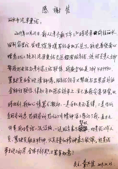 11月18日,東站服務(wù)臺(tái)收到了乘客章興佳親手送來(lái)的一封感謝信,這是一封寫(xiě)給東站業(yè)務(wù)站站長(zhǎng)鄭宣偉的感謝信,信中寫(xiě)到失主章興佳于10月21日從景寧乘車(chē)到麗水,不慎將手機(jī)遺落在車(chē)上,在他發(fā)現(xiàn)手機(jī)不見(jiàn)后,抱著僥幸的心里來(lái)到服務(wù)臺(tái)尋求幫助時(shí),業(yè)務(wù)站站長(zhǎng)鄭宣偉第一時(shí)間幫他聯(lián)系駕駛員尋找手機(jī)的事情。