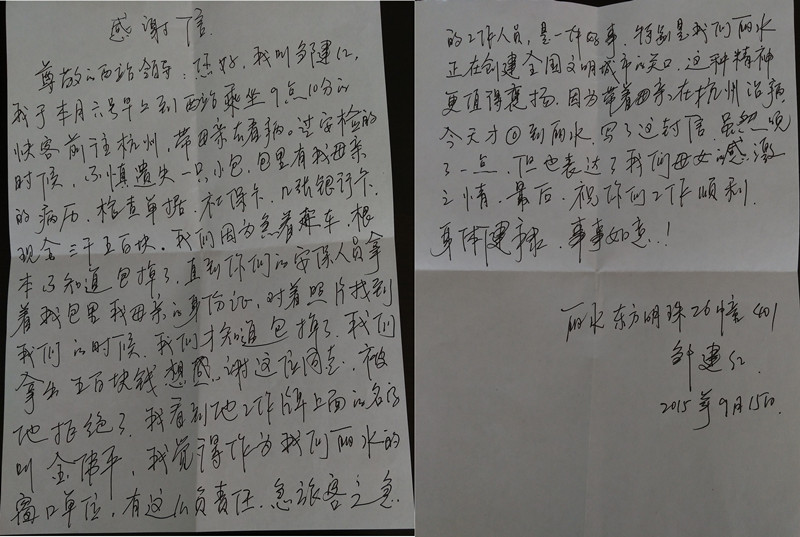 盡快送回“救命錢”,對金偉平來說,是做好本職工作,但對鄒女士母女來說,卻也猶如雪中送炭,正如鄒女士在信中寫道,“作為我們麗水的窗口單位(客運西站),有這樣負責任,急旅客之急的工作人員,是一件好事,特別是我們麗水正在創(chuàng)建全國文明城市的關口,這種精神更值得表揚?!?/p>