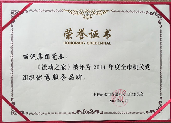 近日,麗汽集團(tuán)“流動之家”服務(wù)品牌在中共麗水市直屬機(jī)關(guān)工作委員會開展的2014年度全市機(jī)關(guān)黨組織優(yōu)秀學(xué)習(xí)品牌、優(yōu)秀服務(wù)品牌評選活動中,喜獲“2014年度全市機(jī)關(guān)黨組織優(yōu)秀服務(wù)品牌”稱號。