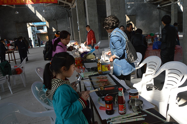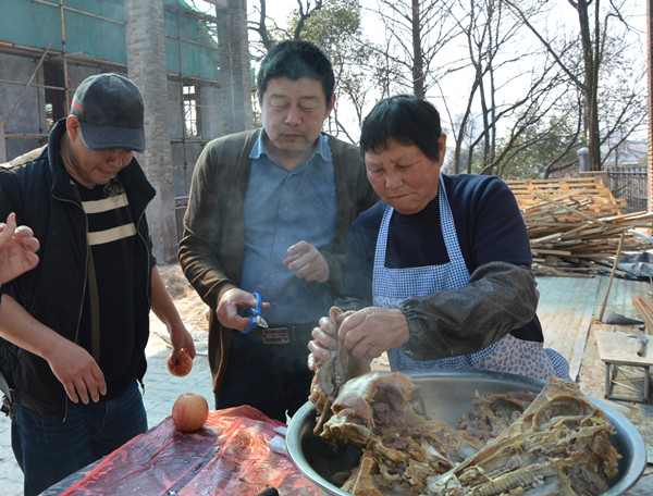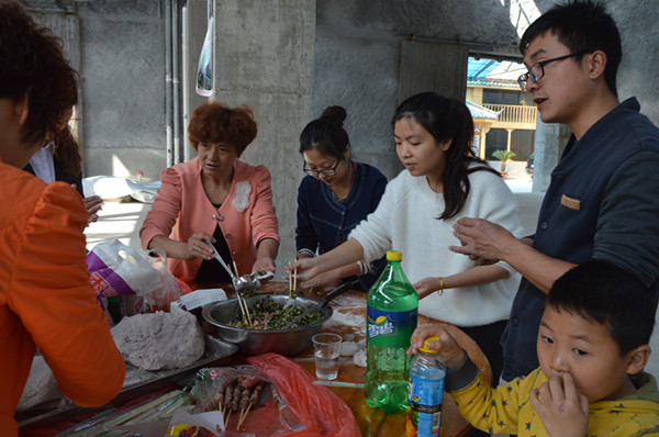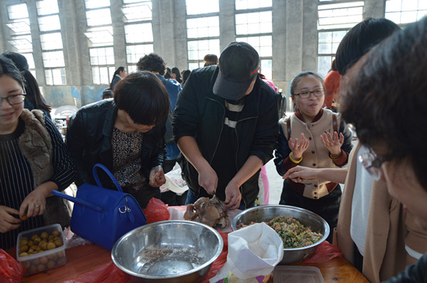 這邊包餃子的問(wèn)題正討論的激烈,那邊熱氣騰騰的豬頭也出鍋了。“呀,這么大的豬頭,小時(shí)候過(guò)年的感覺(jué)”?!皩?duì)啊,對(duì)啊,這種氣氛,這種味道,太有紀(jì)念意義了”。“來(lái)來(lái)來(lái),我拍張照片,微信朋友圈曬一曬”。黃色餃子、綠色餃子、紅色餃子、紫色餃子相繼的出鍋了,燒烤的食品也相繼出爐,大家互相品評(píng),因?yàn)槎际亲约簞?dòng)手參與,一切都變成了美食。
