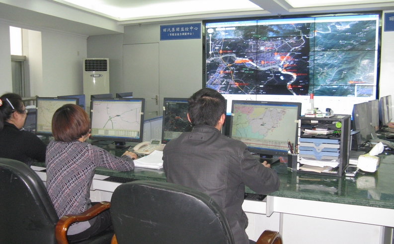 麗汽集團(tuán)的工作人員在GPS系統(tǒng)監(jiān)控室監(jiān)控所屬的180多輛營(yíng)運(yùn)客運(yùn)車輛運(yùn)行狀況。