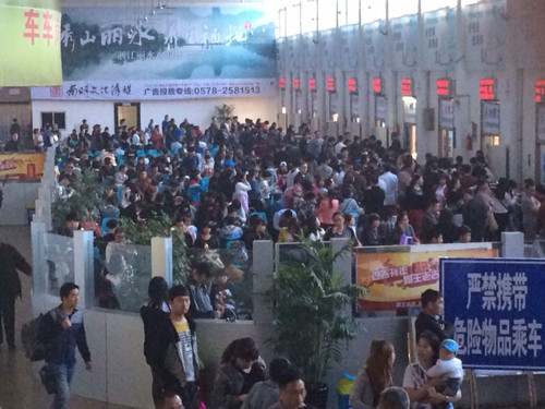 從中午11點(diǎn)起,客運(yùn)東西兩站售票窗口就排起了長隊(duì),候車大廳座無虛席,檢票口和通道處被圍的水泄不通。