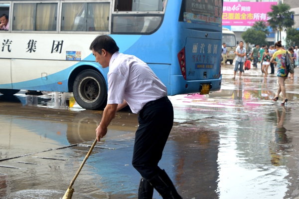 東站的站場上,到處是兄弟單位救援人員的身影。有的參與到電力搶修、有的維護秩序、有的引乘導乘,大部分人參與到清掃站場中:前面人員拉起消防帶、把好水槍,沖到哪片淤泥,后面人員就掄起掃把跟到哪,快速把污泥、污水沖掃到陰溝里,配合得恰當好處。烈日下,個個揮汗如雨,濕透了衣服,有的赤著腳,有的索性光著膀子。水槍沖到哪,掃到哪,身后留下一片片潔凈的場地。