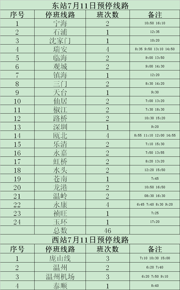 因臺風(fēng)“燦鴻”影響,為確保乘客安全,麗汽集團(tuán)客運東、西兩站暫時停開下列班車,具體復(fù)班時間視11日臺風(fēng)情況再行公告。