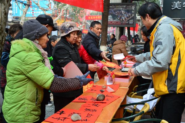 黨員們在中山街上頂著寒風(fēng),冒著嚴(yán)寒,不斷為市民們送福字,寫對聯(lián),送對聯(lián),把暖暖的祝福送給市民。據(jù)統(tǒng)計(jì),集團(tuán)公司黨員服務(wù)一條街,送出“?!弊?500余張,送出對聯(lián)200余副,發(fā)放班車時(shí)刻表、旅游信息表等1000余張。