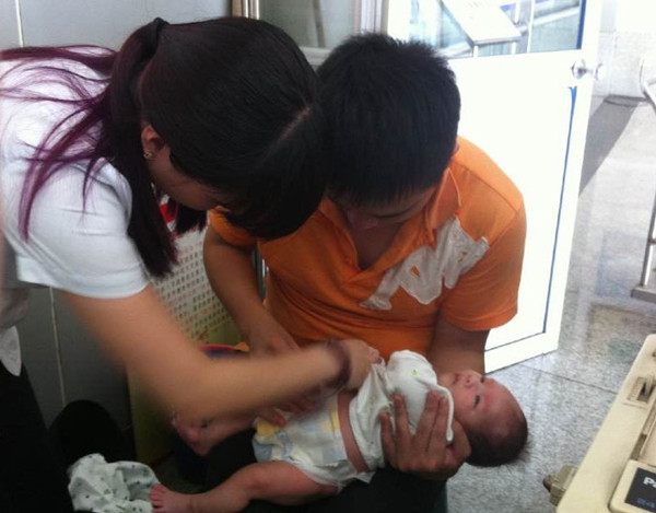 恰在這時(shí),一名年輕的“奶爸”旅客左手拉著一個(gè)行李箱,背后背著一個(gè)大包,右手還抱著一個(gè)尚在襁褓中嚶嚶哭泣的小嬰兒,滿頭大汗的來到服務(wù)臺(tái)前,小寶寶可能肚子餓了,一直在哭泣,小寶寶的媽媽又沒有隨行,只有爸爸一個(gè)人對(duì)付小家伙,實(shí)在是沒轍了,只得到服務(wù)臺(tái)求助。